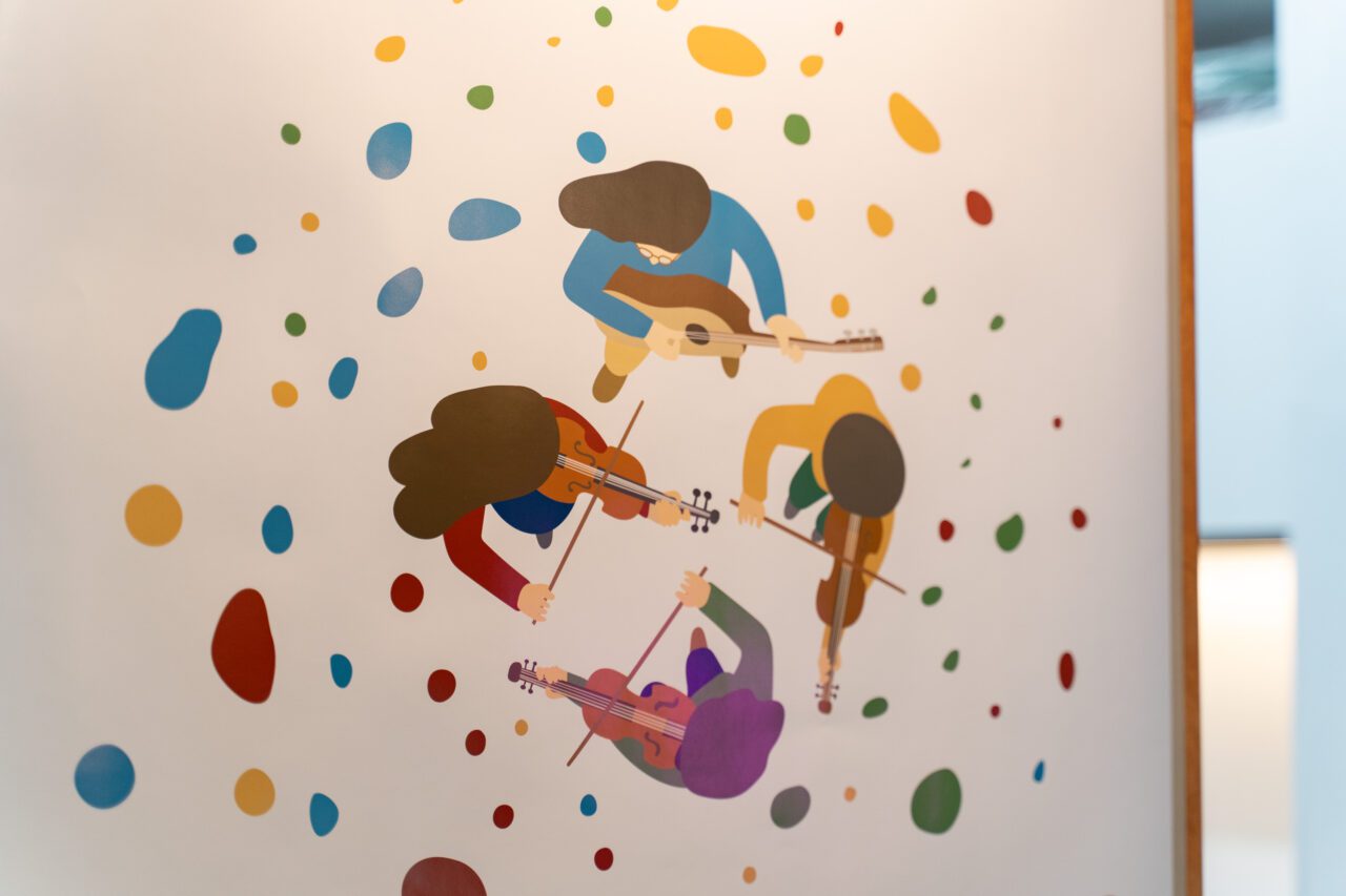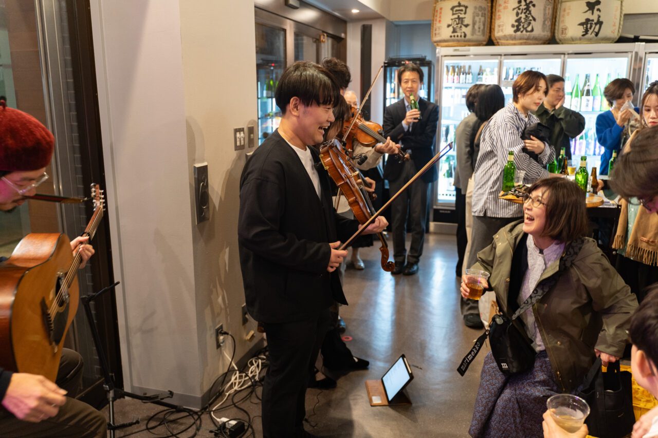 オードインクのフィドルクラスで学ぶ岡さん、ライブ前の緊張の時間ですがお友達が駆けつけてくれてリラックスの一コマ。
