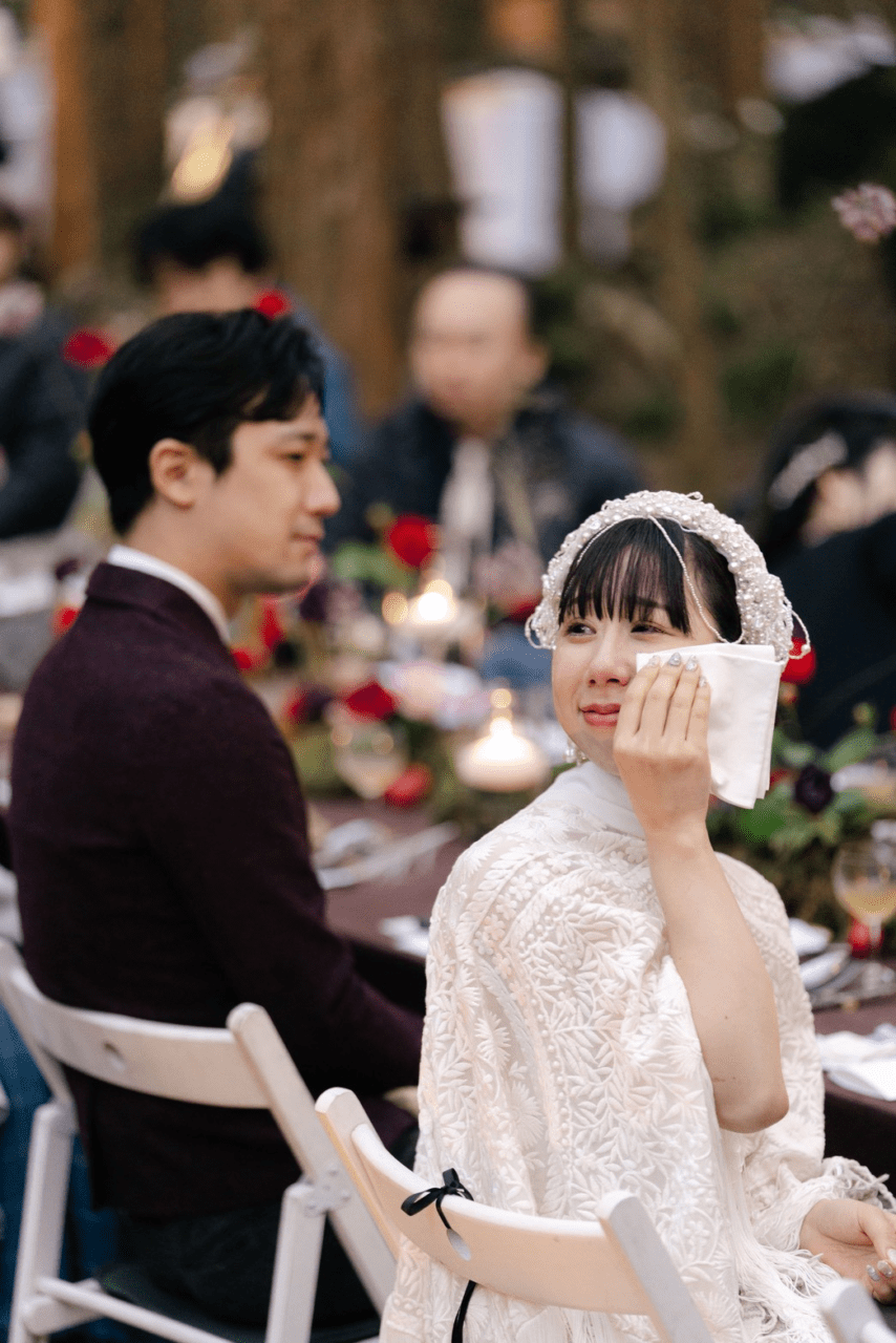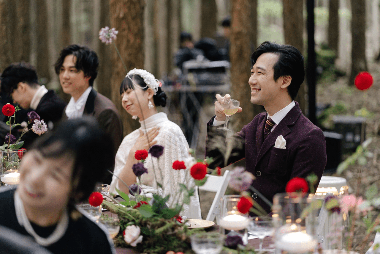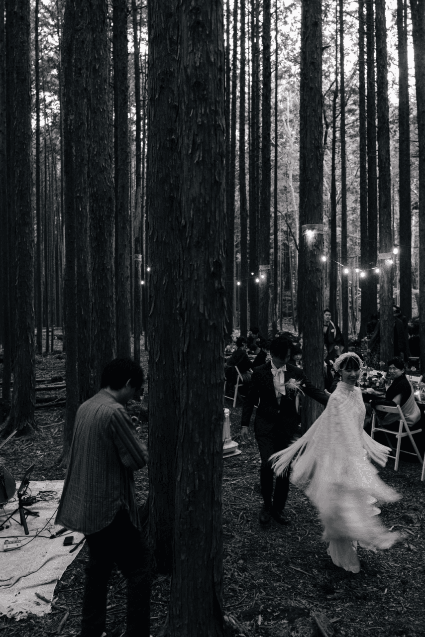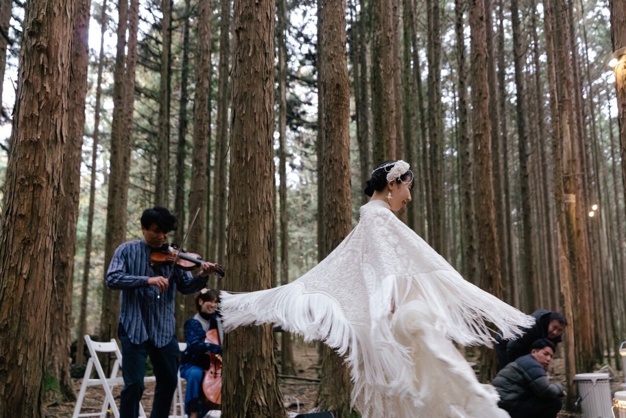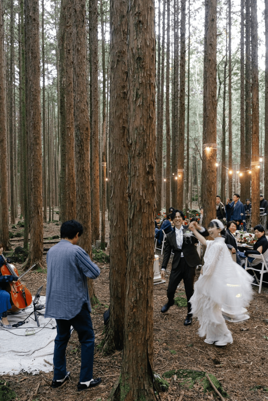林の中にこの日のためだけに作られた披露宴会場。優しさのこもったお料理や美しい装飾に囲まれた空間。野外ではあるのですが楽器の音が周りの木々に音が反響してホールのように響くという不思議な体験でした。