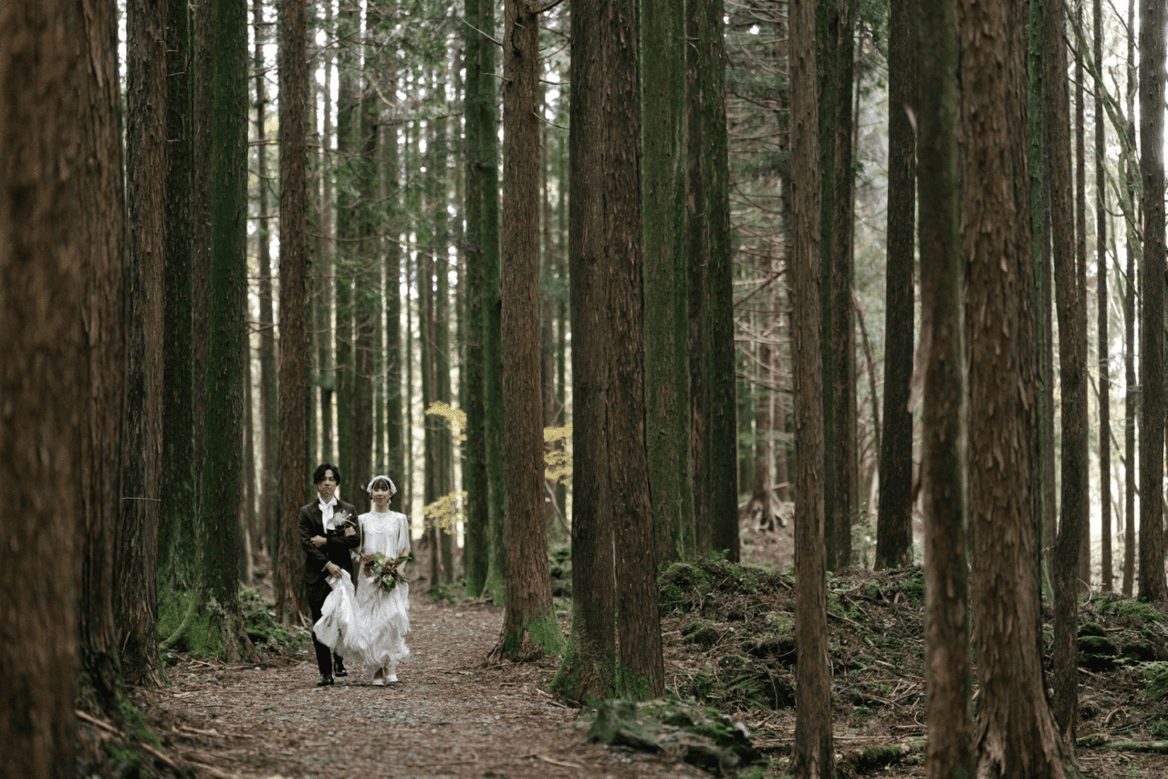 林の中、入場されるお二人。