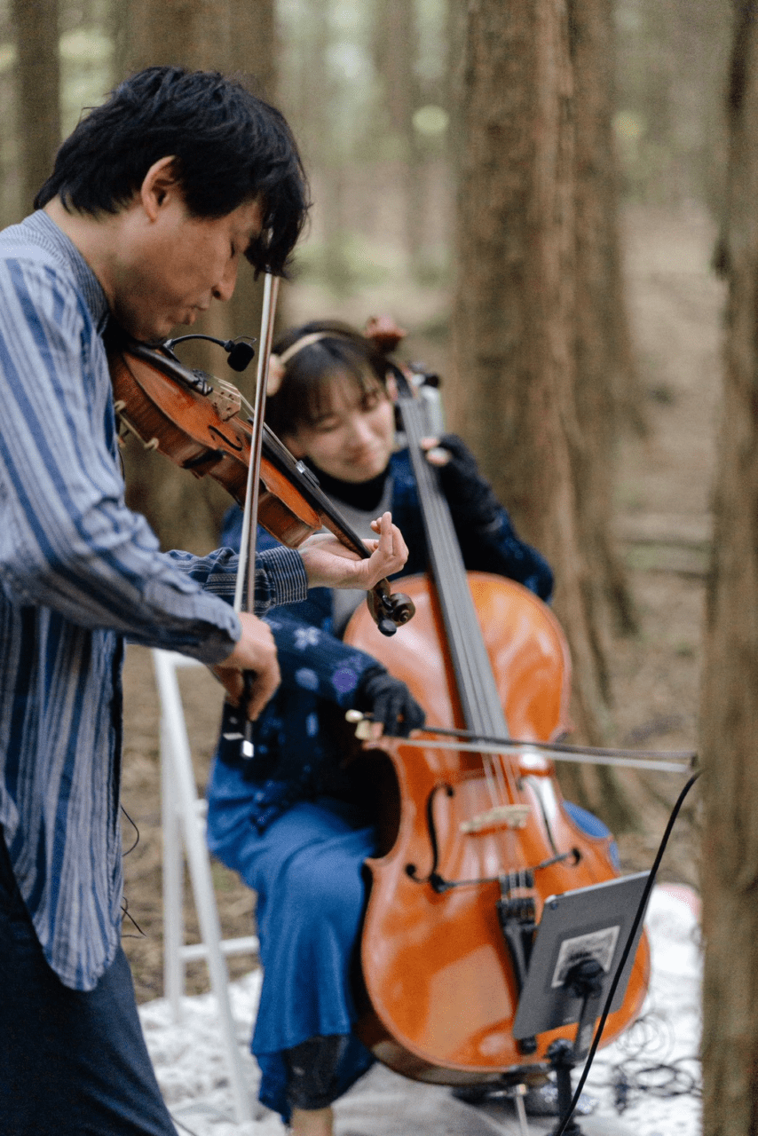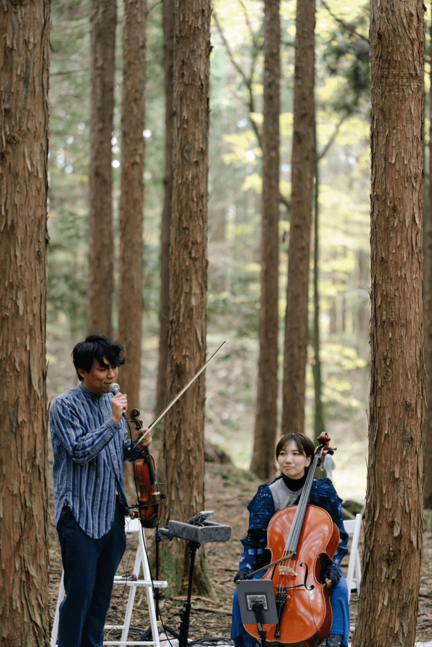 2025年の秋のある日、朝霧高原の林の中で開かれた素敵なウェディングパーティーでストリンガーズがアイルランド音楽の演奏を担当させていただきました。
