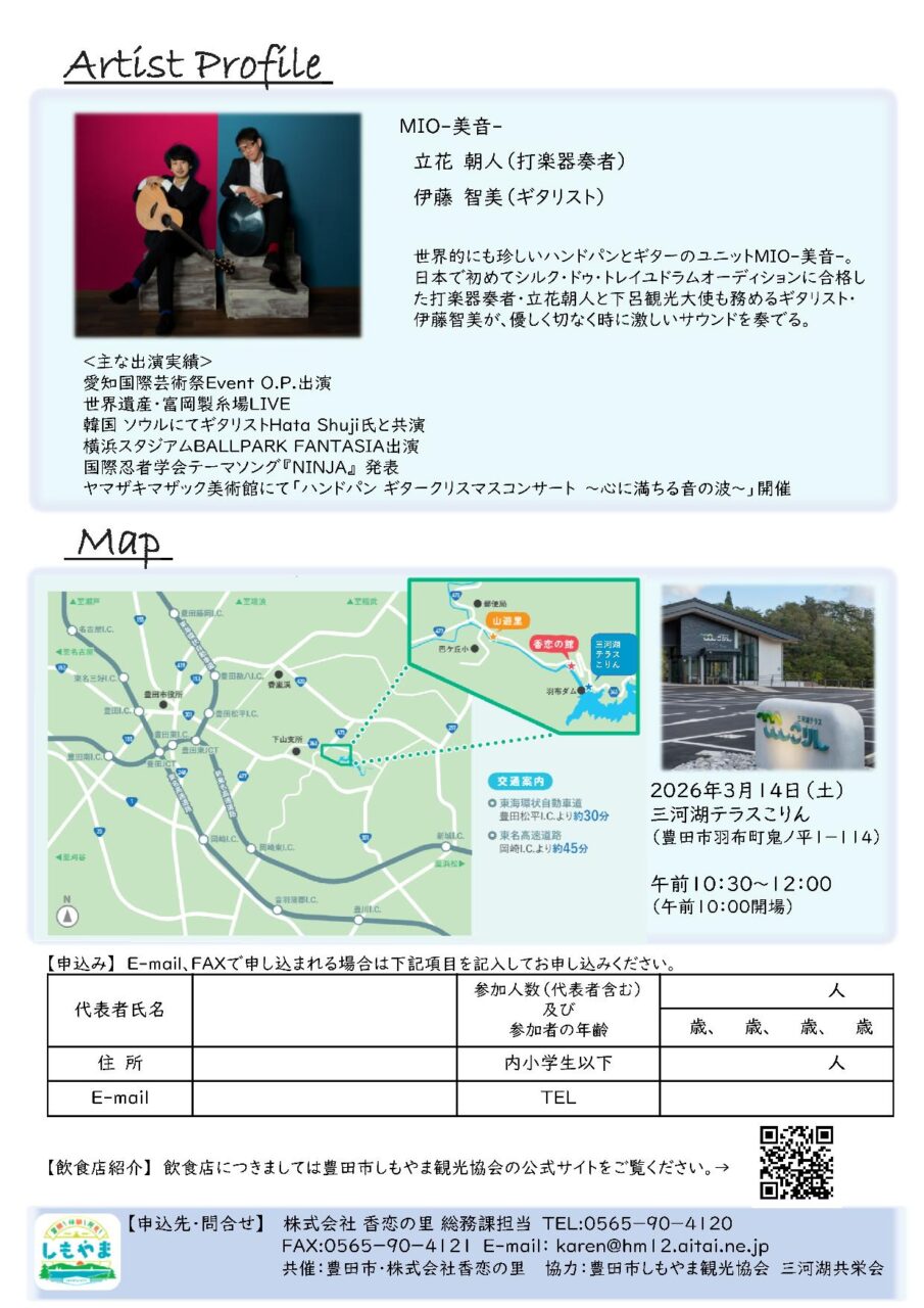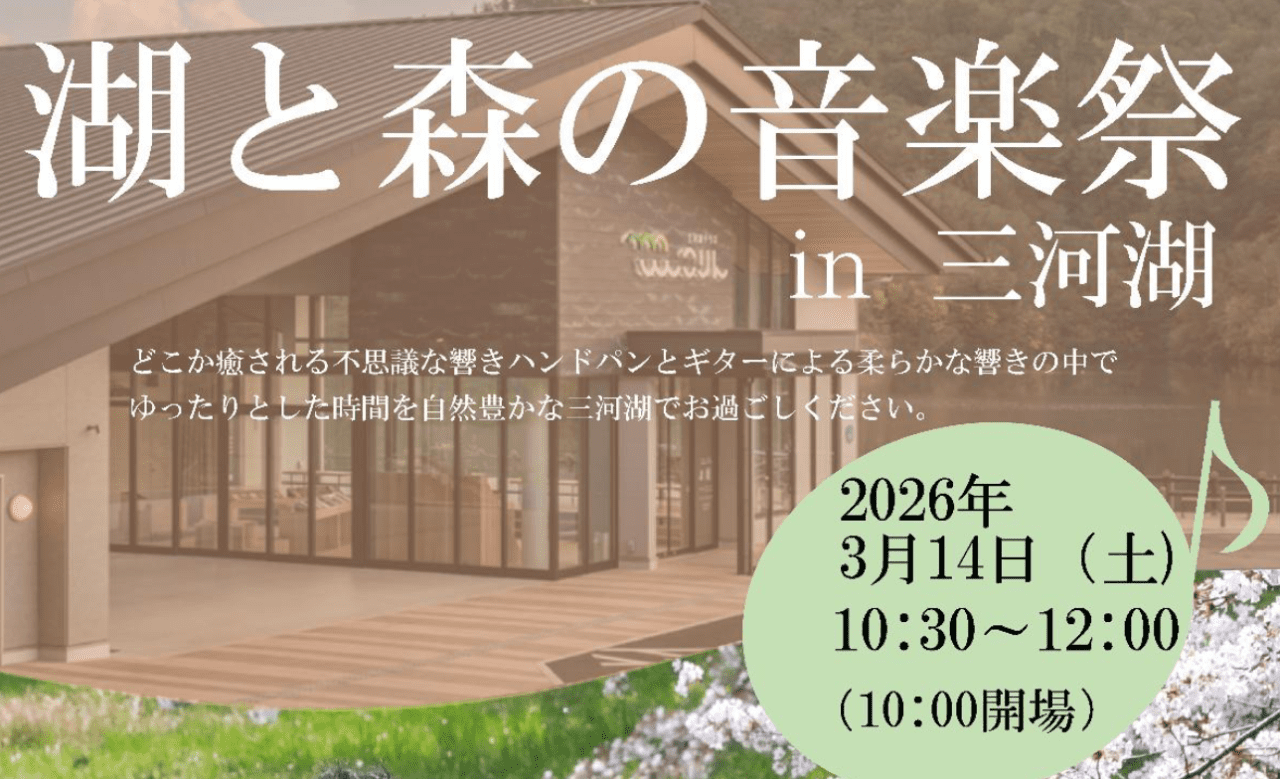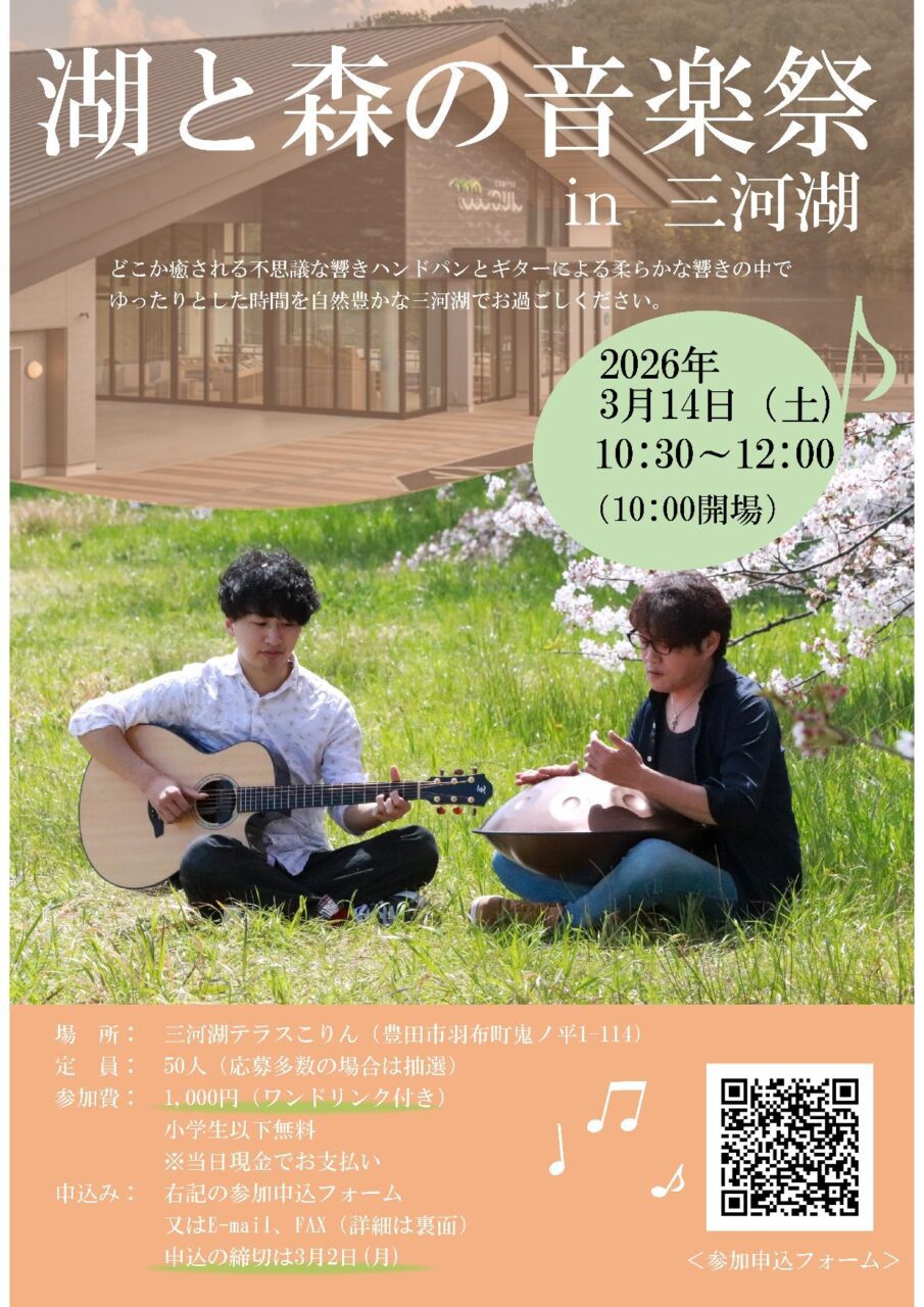 自然豊かな三河湖のほとり「三河湖テラスこりん」でアコースティックデュオMIOのライブが開催されます。美しい自然の中でどこか癒される不思議な響きハンドパンとギターによるライブをお楽しみください。