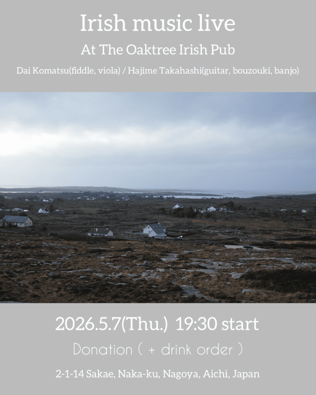 名古屋伏見に新しいアイリッシュパブ『Oaktree』(オークツリー)がオープン!アイルランド伝統音楽を愛するオーナーさんのお店です。5月7日、小松大と高橋創によるアイリッシュミュージックをどうぞお楽しみに。